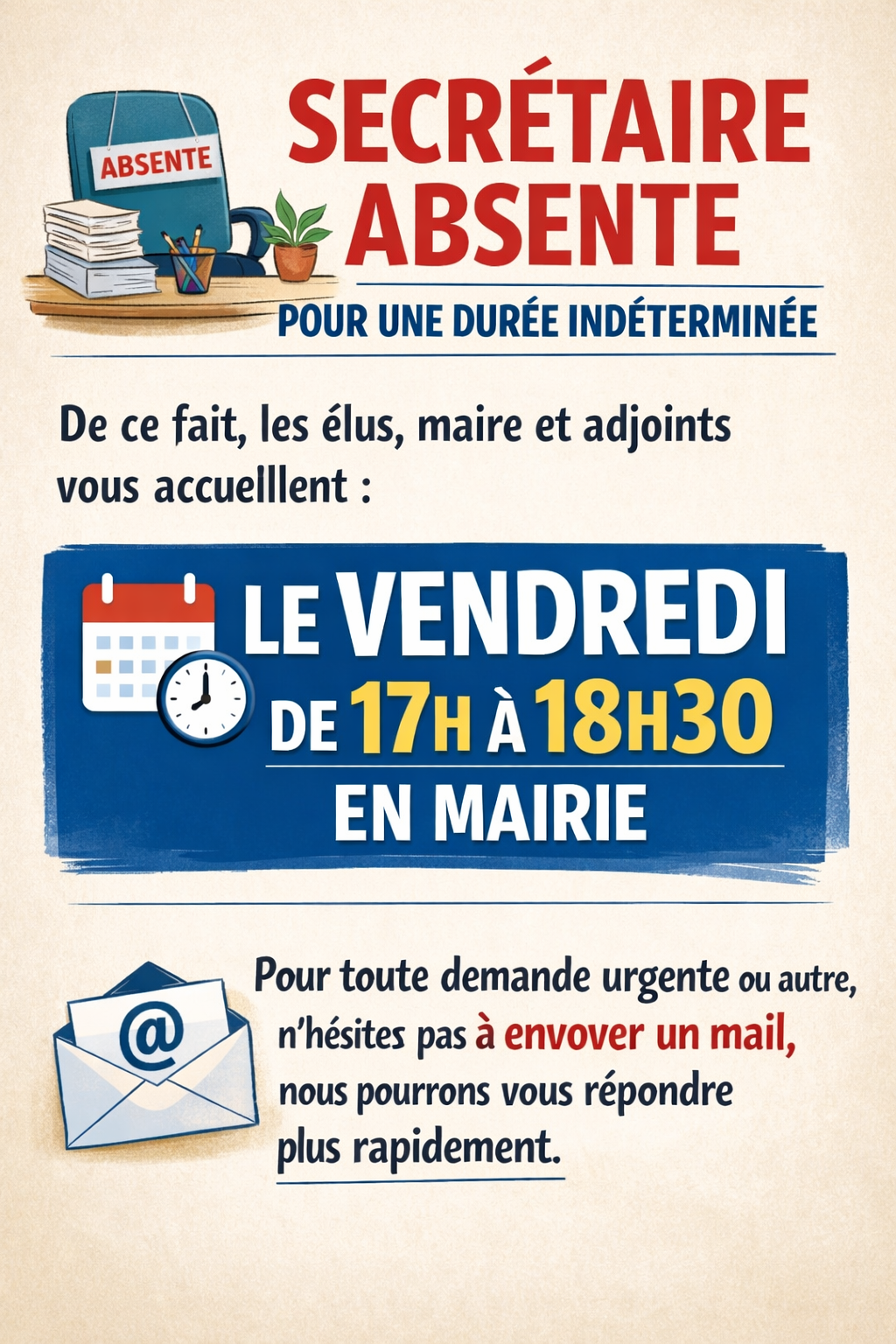 - réservation de la salle des fêtes par mail ou directement en mairie le vendredi