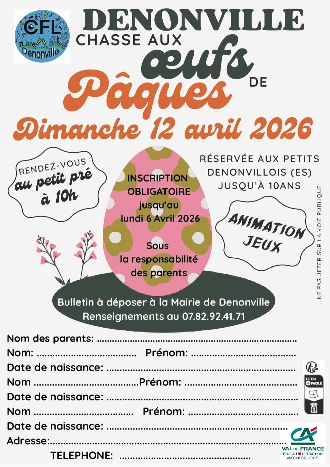 🐰Le Comité des Fêtes et des Loisirs de Denonville invite les enfants de Denonville et ses hameaux à la Chasse aux œufs qui aura lieu