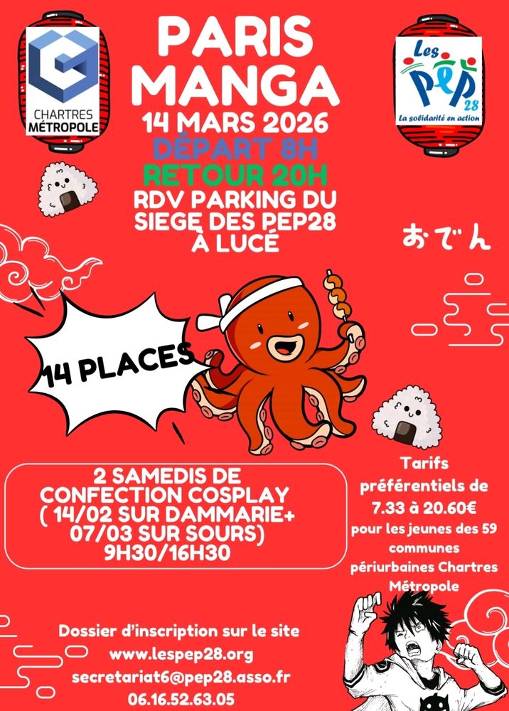 réalisés par Chartres métropole et gérés par les PEP28, à savoir, deux samedis de confection « Cosplay » (samedi 14 février et samedi 7 mars 2026) et un samedi pour participer pleinement à l’évènement PARIS MANGA le 14 mars 2026.