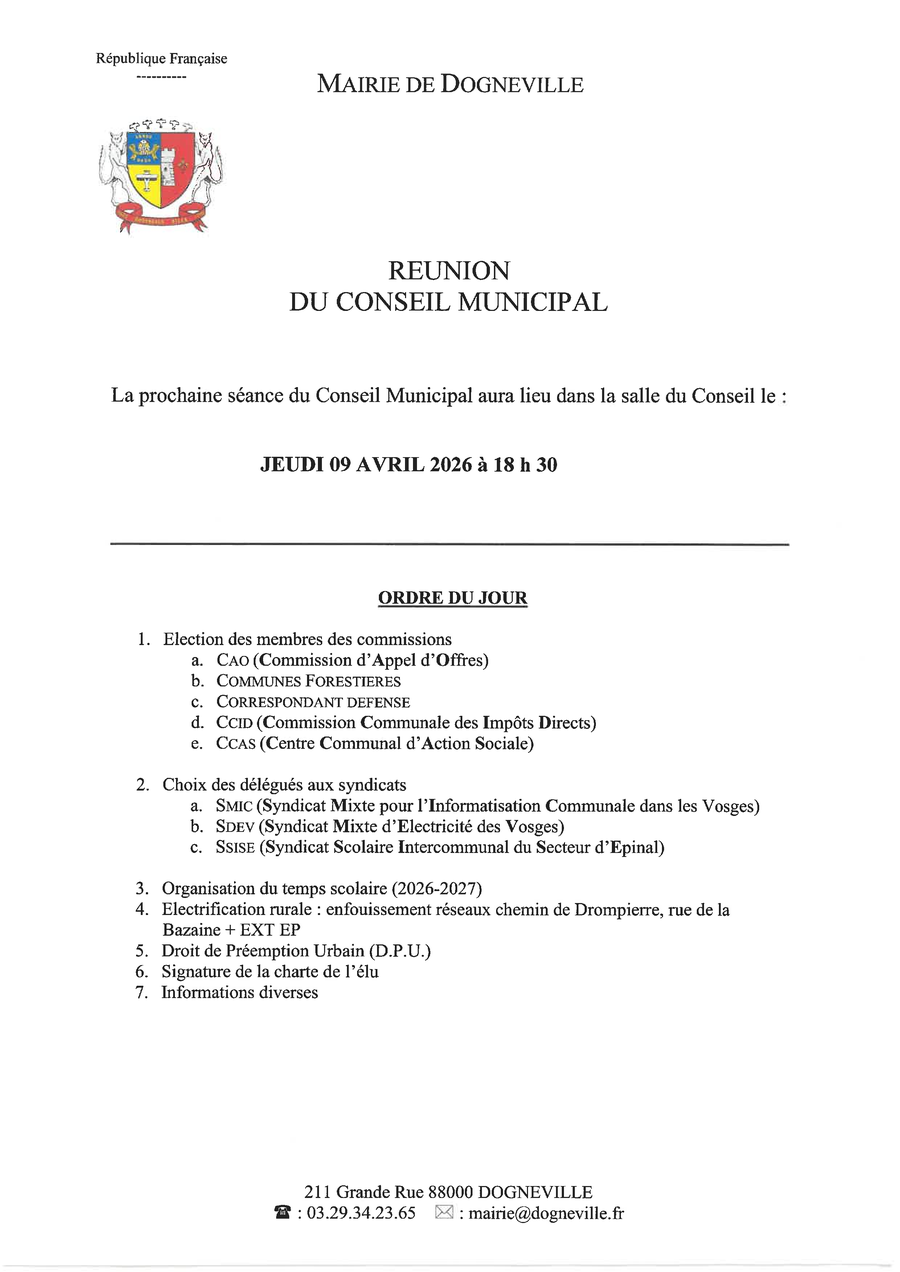 La prochaine séance du conseil aura lieu le JEUDI 09 AVRIL prochain à 18H30