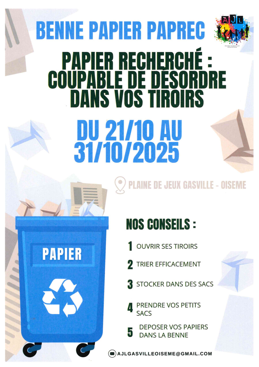 L'Association Jeunesse et Loisirs de Gasville-Oisème organise une collecte de papier avec l'entreprise Paprec, pour financer les projets d'activités proposées pour les enfants de la commune.