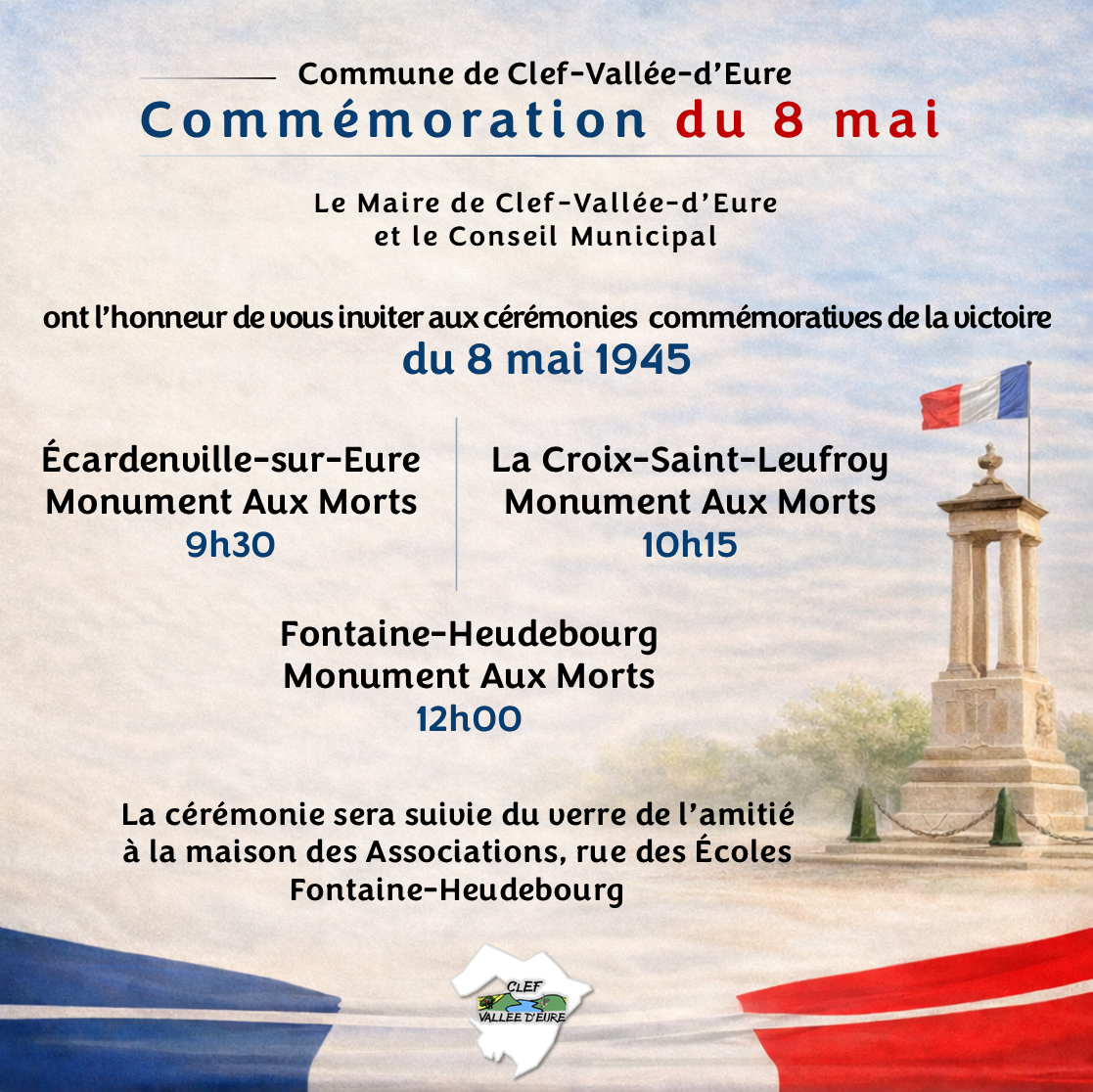 Le Maire et le Conseil Municipal de Clef-Vallรฉe-dโEure ont lโhonneur de vous inviter aux cรฉrรฉmonies commรฉmoratives de la Victoire du 8 mai 1945.