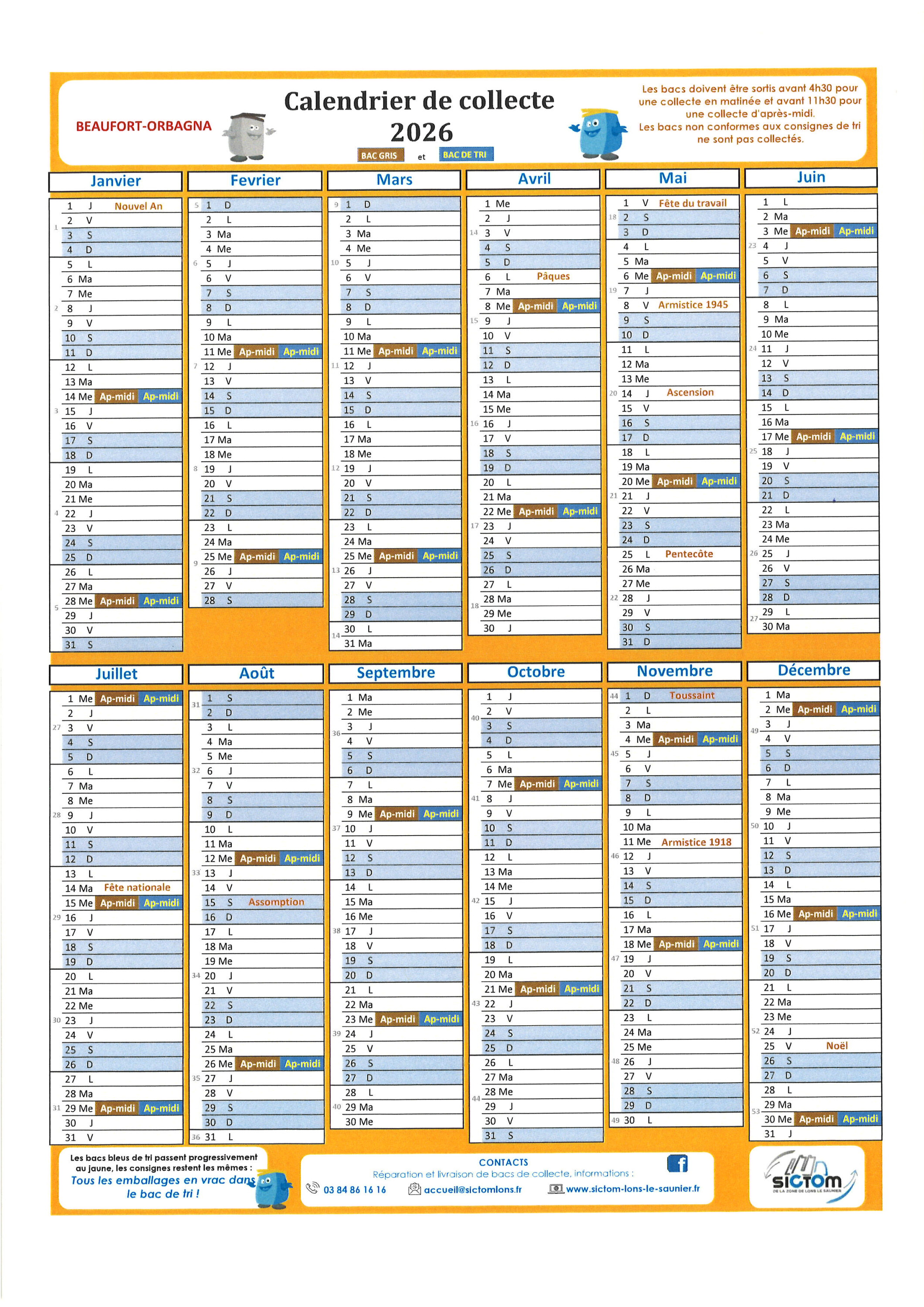 Ci-dessous le calendrier des collectes des bacs marrons et bleus/jaunes pour l'année 2025