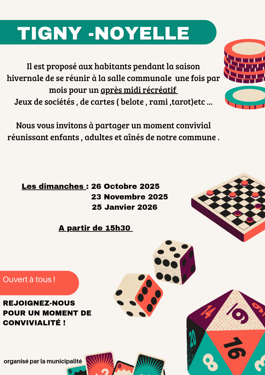 La municipalité propose à ses habitants de se réunir à la salle communale pour des moments récréatifs, jeux de société, cartes.... Noter dés a présent les dates ci dessous dans vos agendas !!!!