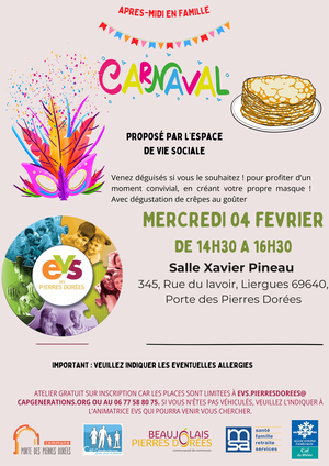 Dans le cadre de l’espace de vie sociale, venez nous rejoindre avec vos enfants afin de profiter d’un après-midi en famille sur le thème de Carnaval, animé par votre animatrice EVS 😃
