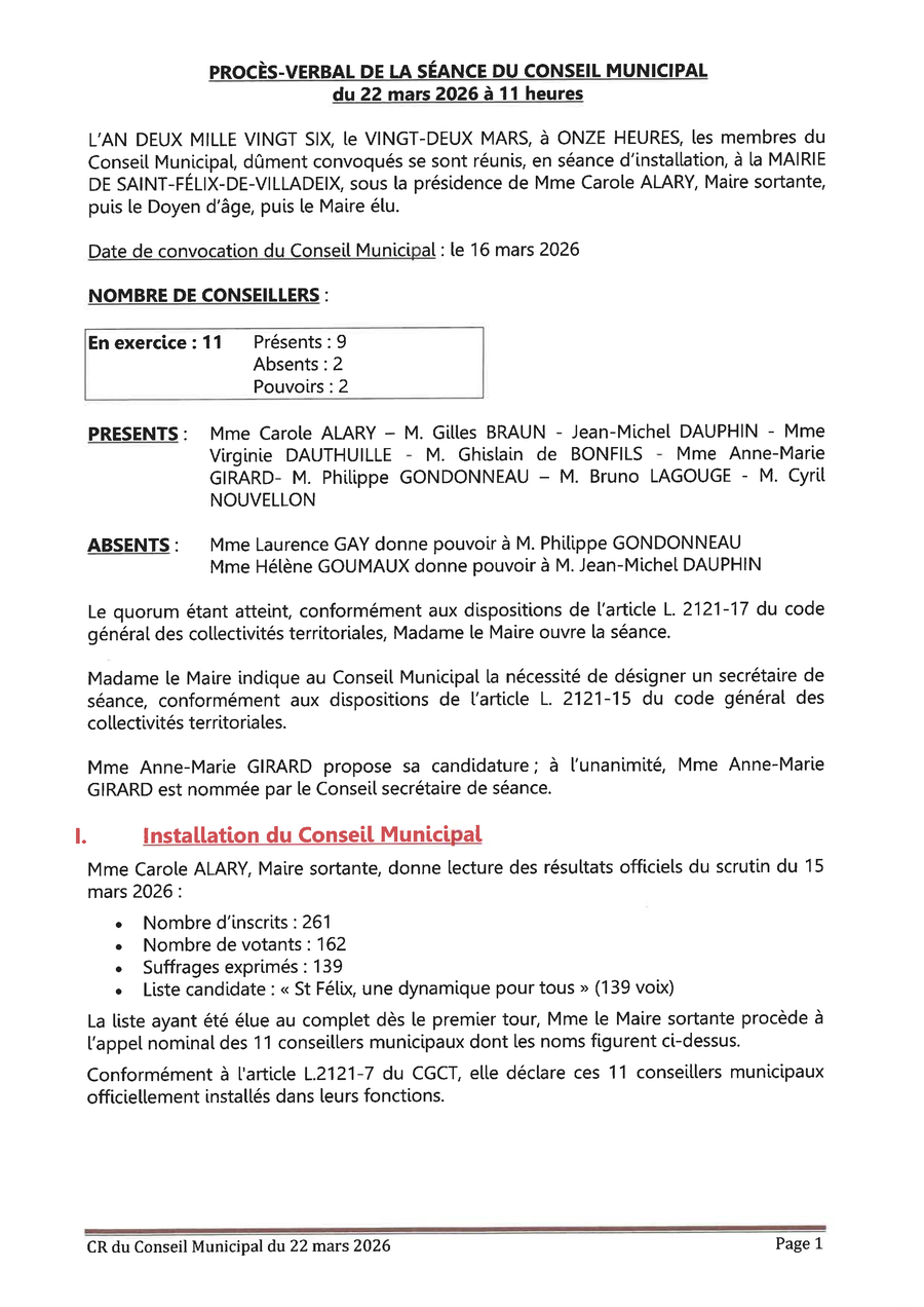 Veuillez trouver ci-après le procès-verbal de la séance du 22 mars 2026 du Conseil Municipal de Saint-Félix-de-Villadeix :