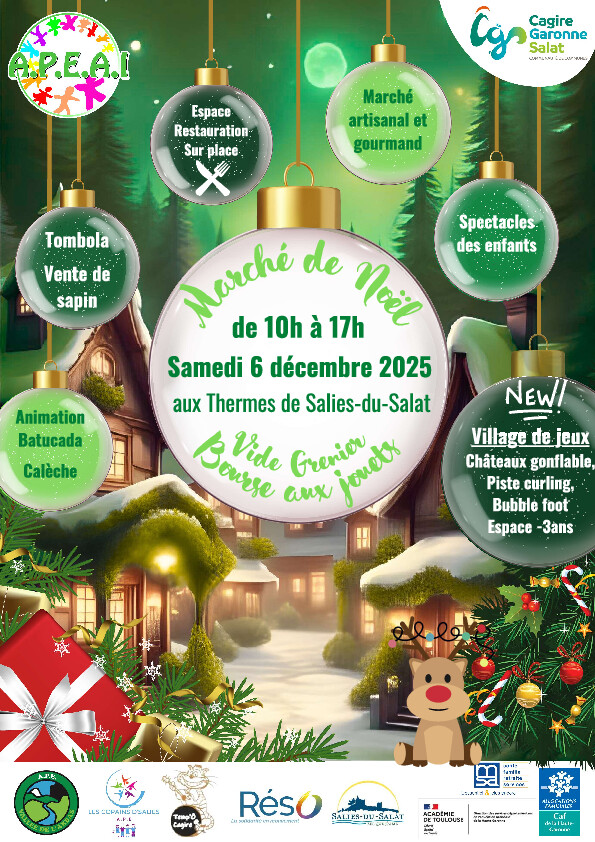 L’APEAI organise un ensemble d’événements à Salies-du-Salat samedi 6 décembre : le Marché de Noël aux Thermes, ainsi que le vide-grenier et la bourse aux jouets situés Place des Marronniers.