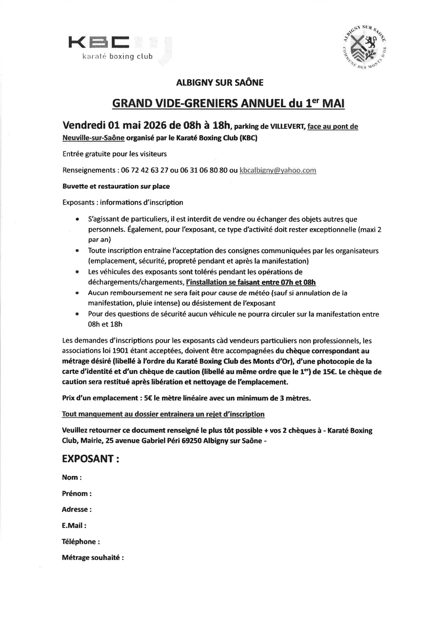 Le vendredi 1er mai, le Parking Villevert accueillera un Grand Vide-Grenier & Brocante, organisé depuis 25 ans par le KBC (Karaté Boxing Club) 😊