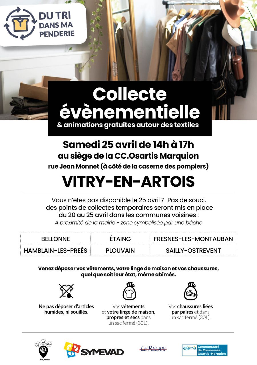 👉 La tournée "Du tri dans ma penderie" du SYMEVAD est de retour le 25 avril prochain pour une grande journée de collecte au siège de la communauté de commune Osartis-Marquion.