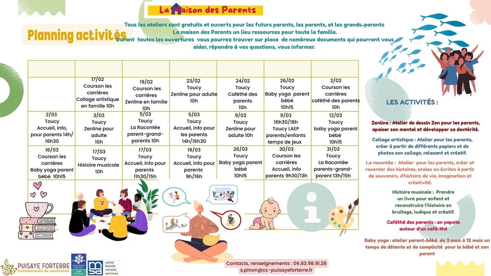 Vous pourrez également participer lors des permanences à des ateliers pour les parents : zenline, relaxation, collage, groupe de parole, écriture, cuisine, et autres…et à des ateliers parents/enfants : baby yoga, baby réflexologie, motricité, éveil corporel, dessin, collage…les plannings d’activités seront mis en ligne sur le site de la com com.
