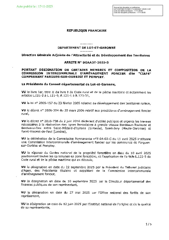 Monsieur le Maire de la commune de Fargues sur Ourbise porte à votre connaissance l'Arrêté N° DGAADT-2025-3 en date du 14/11/2025 de la Présidente du Conseil Départemental de Lot-et-Garonne constituant la Commission Locale d'Aménagement Foncier liée à la LGV.