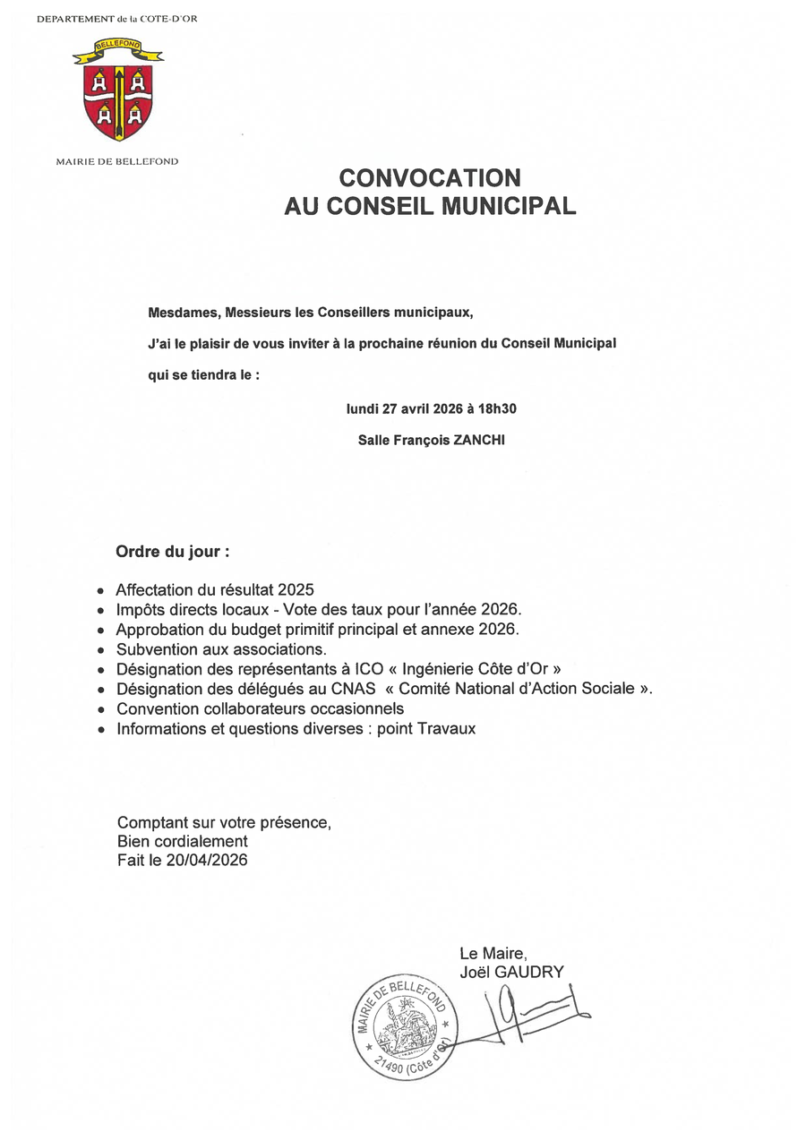 Le prochain Conseil Municipal aura lieu le lundi 27 avril 2026 à 18h30.