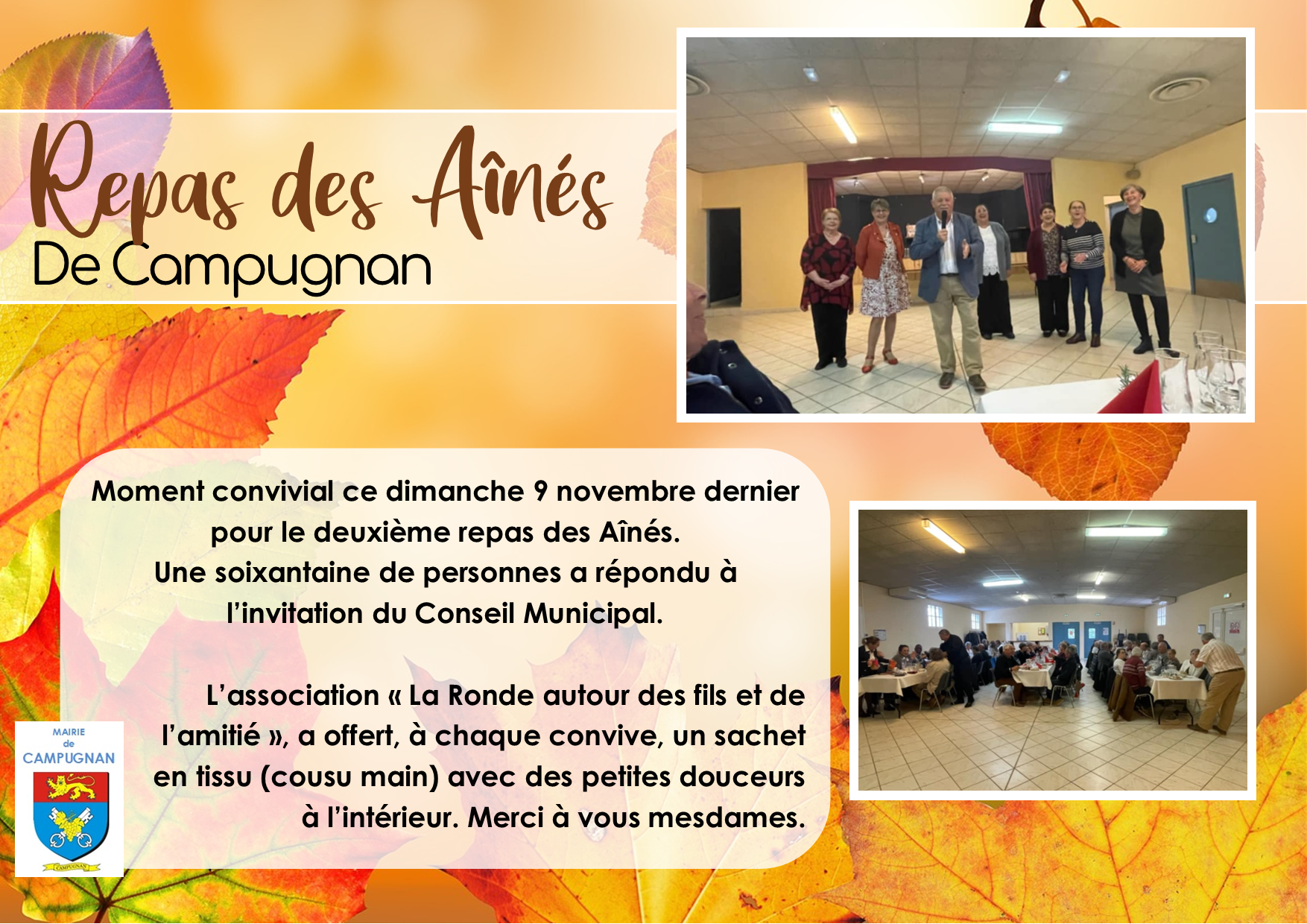 L’association « La Ronde autour des fils et de l’amitié », a offert, à chaque convive, un sachet en tissu (cousu main) avec des petites douceurs à l’intérieur. Merci à vous mesdames.