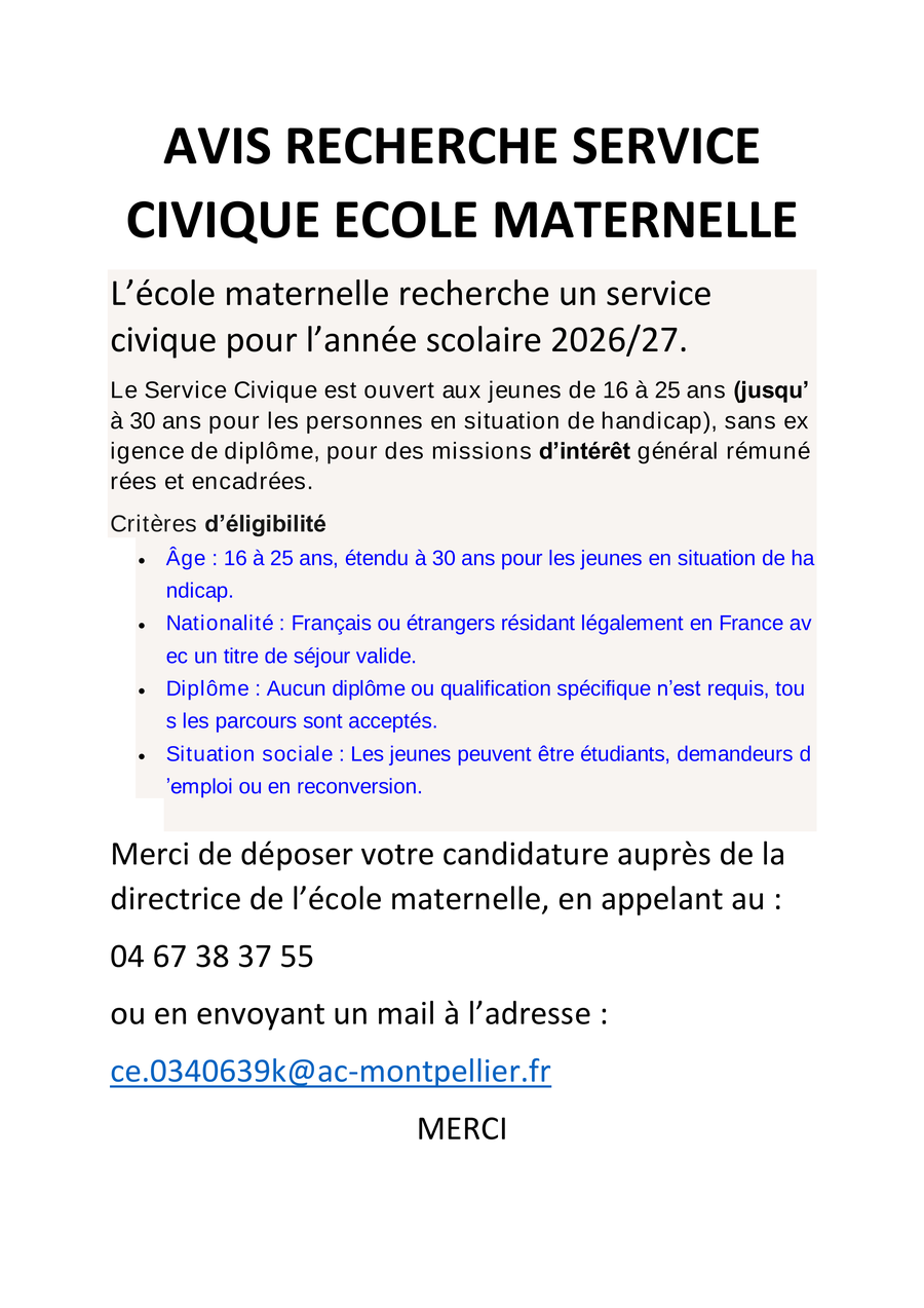 L'école maternelle recherche un service civique pour l'année 2026/2027.