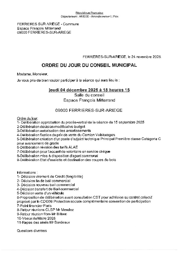 L'ordre du jour est modifié, 2 délibération viennent d'être ajoutées point 8 et 9.