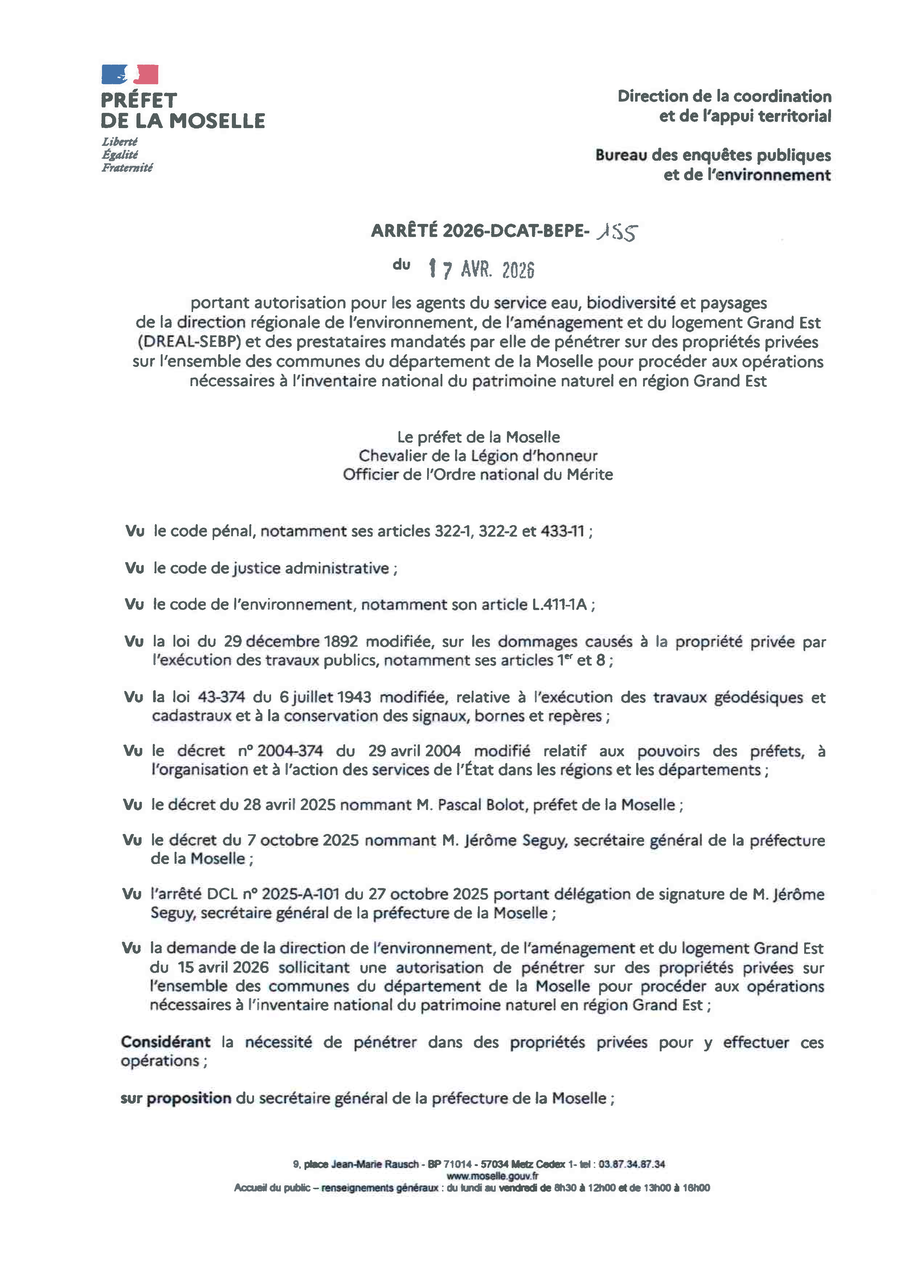 Dans le cadre de la réalisation de l'inventaire national du patrimoine naturel en région Grand Est, les agents de la DREAL et ceux mandatés par elle, sont autorisés à pénétrer dans les propriétés privées sur le territoire de toutes les communes de la Moselle.