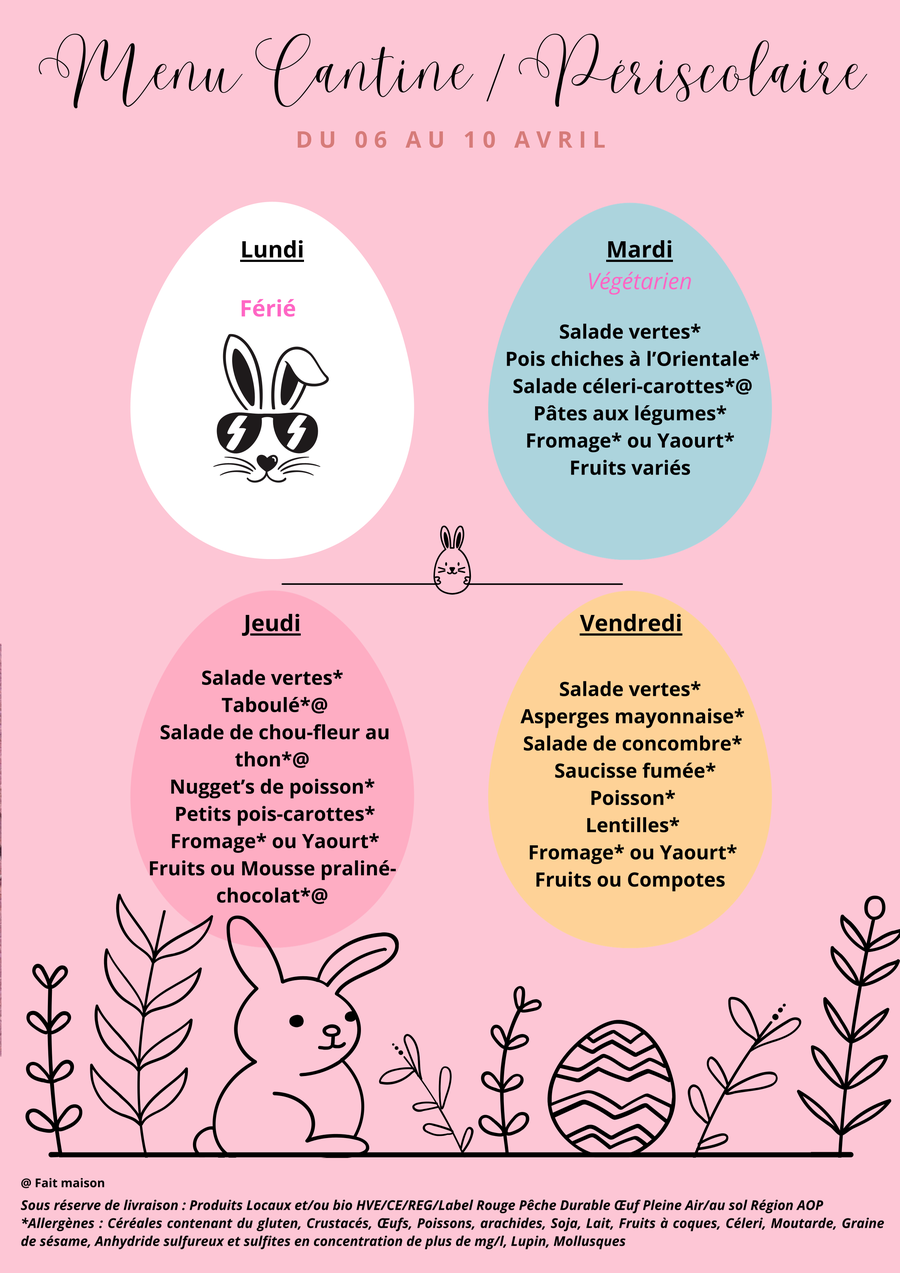 Menu Cantine/Périscolaire du 06 au 10 avril 🍽️