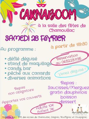 Pour célébrer le carnaval l’Association de parents d'élèves du RPI des écoles de Chamouillac, Salignac, Rouffignac et Courpignac. organise une soirée déguisée ! Avec la présence d'un DJ ! Venez déguisé 🥳🎉