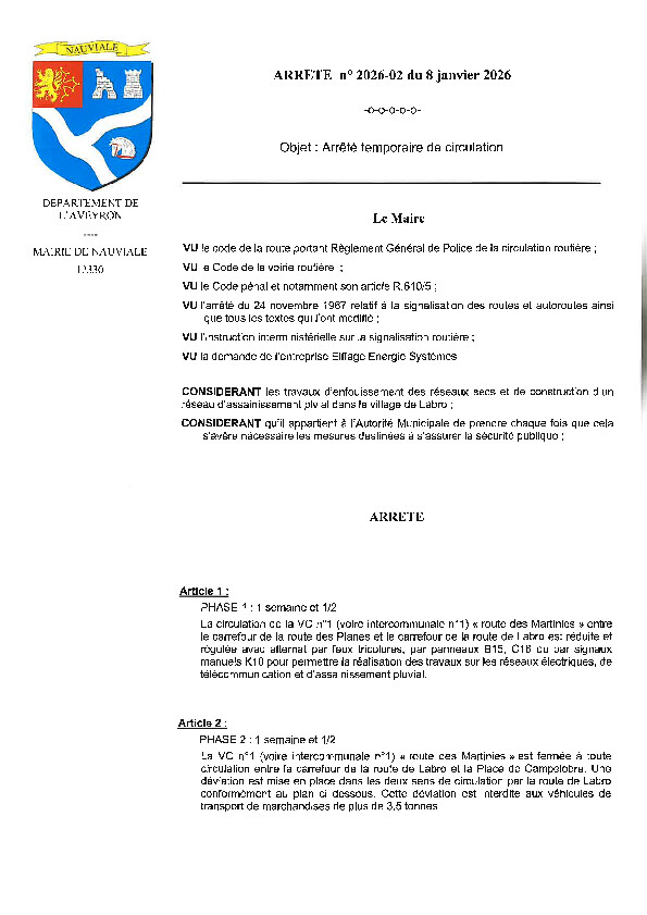 D'autres restrictions seront mises en place à compter du lundi 2 février notamment à l'intérieur du village de Labro pour la poursuite des travaux.