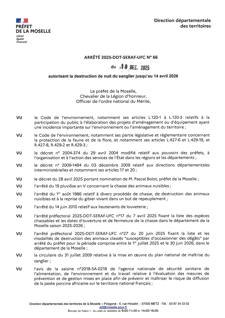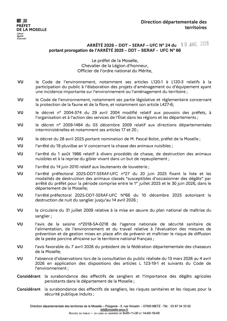 Face à une surabondance marquée des populations de sangliers et à la recrudescence des dégùts constatés sur le département, la Préfecture de la Moselle annonce la prolongation des mesures de destruction nocturne.