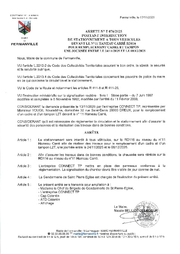 Interdiction de stationner une journée entre le 24/11 et le 08/12/2025 devant le n°11 Hameau Carré(RD116) pour remplacement cadre et tampon télécom