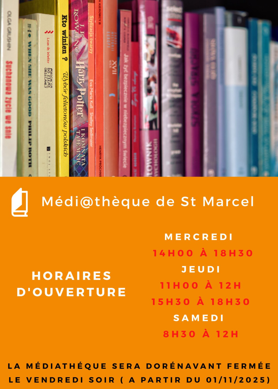 Nous vous informons qu’à compter du 1er novembre 2025, la médiathèque ne sera plus ouverte au public le vendredi soir, de 16h00 à 18h00.