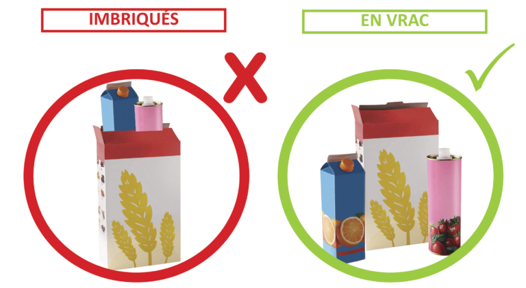 Ne mettez pas les emballages les uns dans les autres. En effet, ceux-ci ne pourront pas être valorisés. Pensez bien à mettre vos emballages en vrac dans votre sac jaune, séparés les uns des autres.