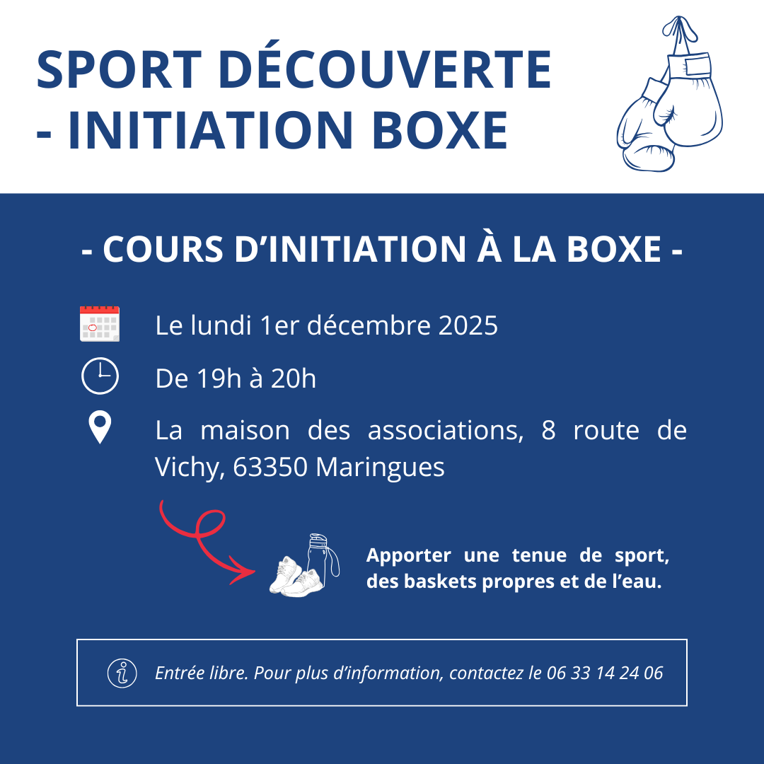 Rendez-vous le lundi 1er décembre 2025, de 19h à 20h, pour une initiation à la boxe, à la maison des associations.
