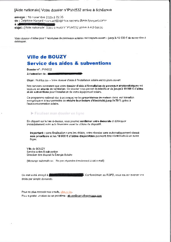🚨Nous avons été informés que des messages frauduleux circulent actuellement, prétendant provenir de la mairie et vous invitant à “finaliser un dossier d’aide à l’installation solaire”.
