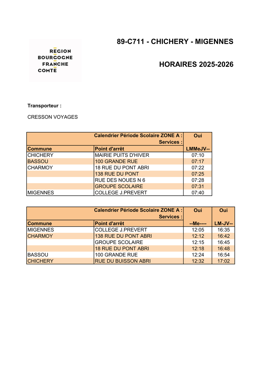 En raison de travaux, du 09 au 12/03/2026 inclus, les horaires de passage aux différents points d’arrêt de la ligne scolaire 89-C711 seront modifiés durant cette période, uniquement sur le trajet retour.