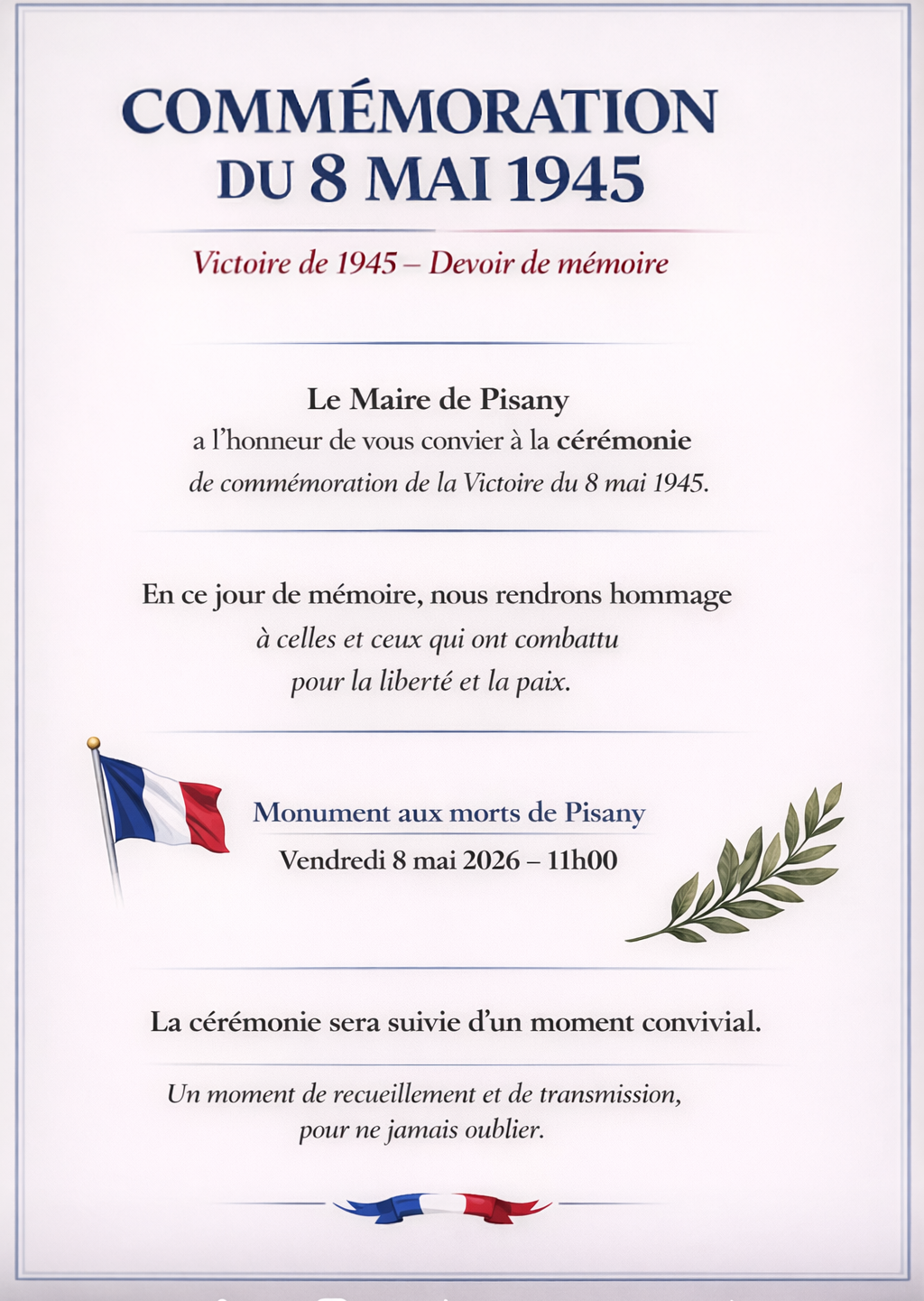 Le Maire de Pisany, Monsieur Pierre TUAL, ainsi que le Conseil Municipal, ont l’honneur de vous inviter à la cérémonie commémorative de la victoire du 8 mai 1945.