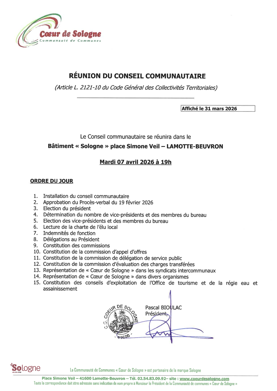 Le conseil Communautaire se réunira :