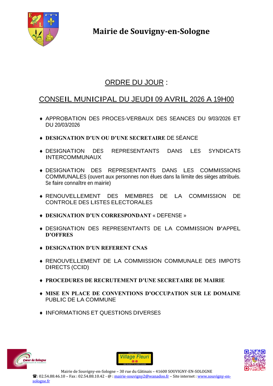 Le conseil Municipal se réunira en séance ordinaire à la Mairie