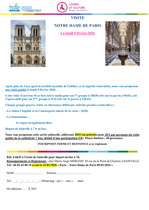 - le lundi 09/02/2026 : Sortie Paris pour visiter Notre Dame de Paris, avec un guide