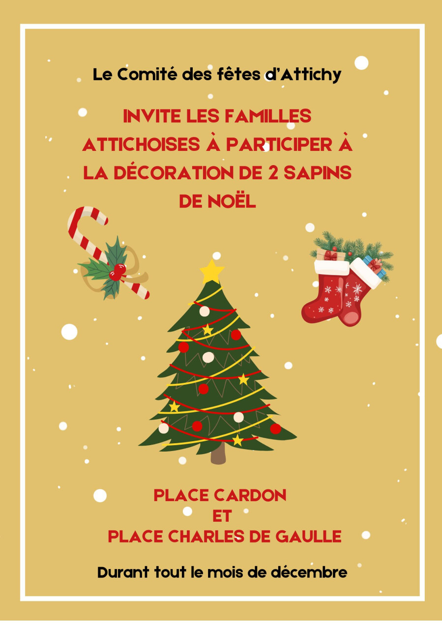 Le Comité des fêtes d’Attichy invite chacun à venir décorer les sapins librement tout au long du mois de décembre. Vous pouvez y accrocher vos propres décorations, à votre convenance, afin de faire briller les deux sapins de Noël !