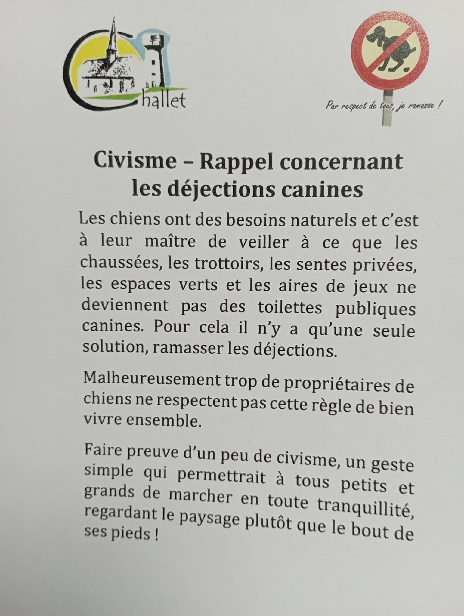 - merci de ramasser les déjections de vos chiens que vous promenez sur les trottoirs et les espaces verts.