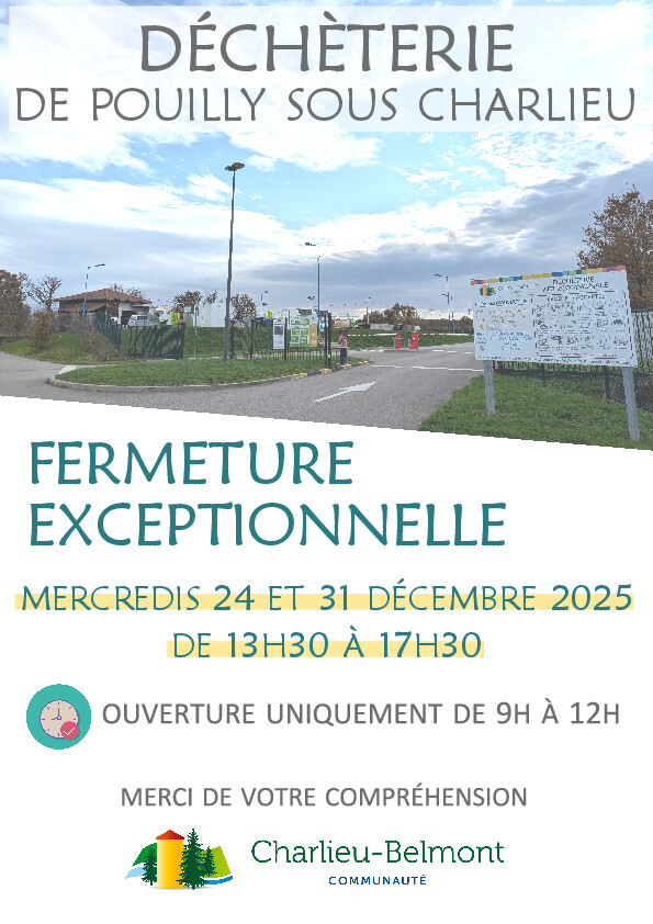 🚫 La déchèterie de Pouilly-sous-Charlieu sera exceptionnellement fermée l'après-midi de 13h30 à 17h30