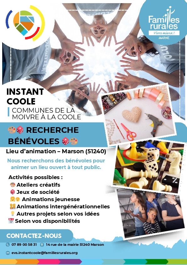 Le lieu d'animation Instant Coole de Marson recherche des bénévoles pour animer un lieu ouvert à tout public.
