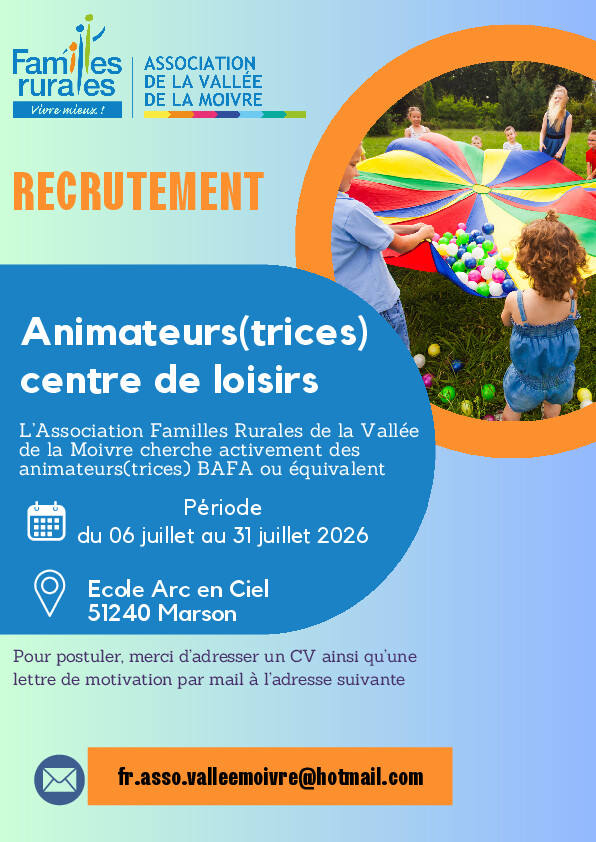 L’Association Familles Rurales de la Vallée de la Moivre cherche activement des animateurs(trices) BAFA ou équivalent