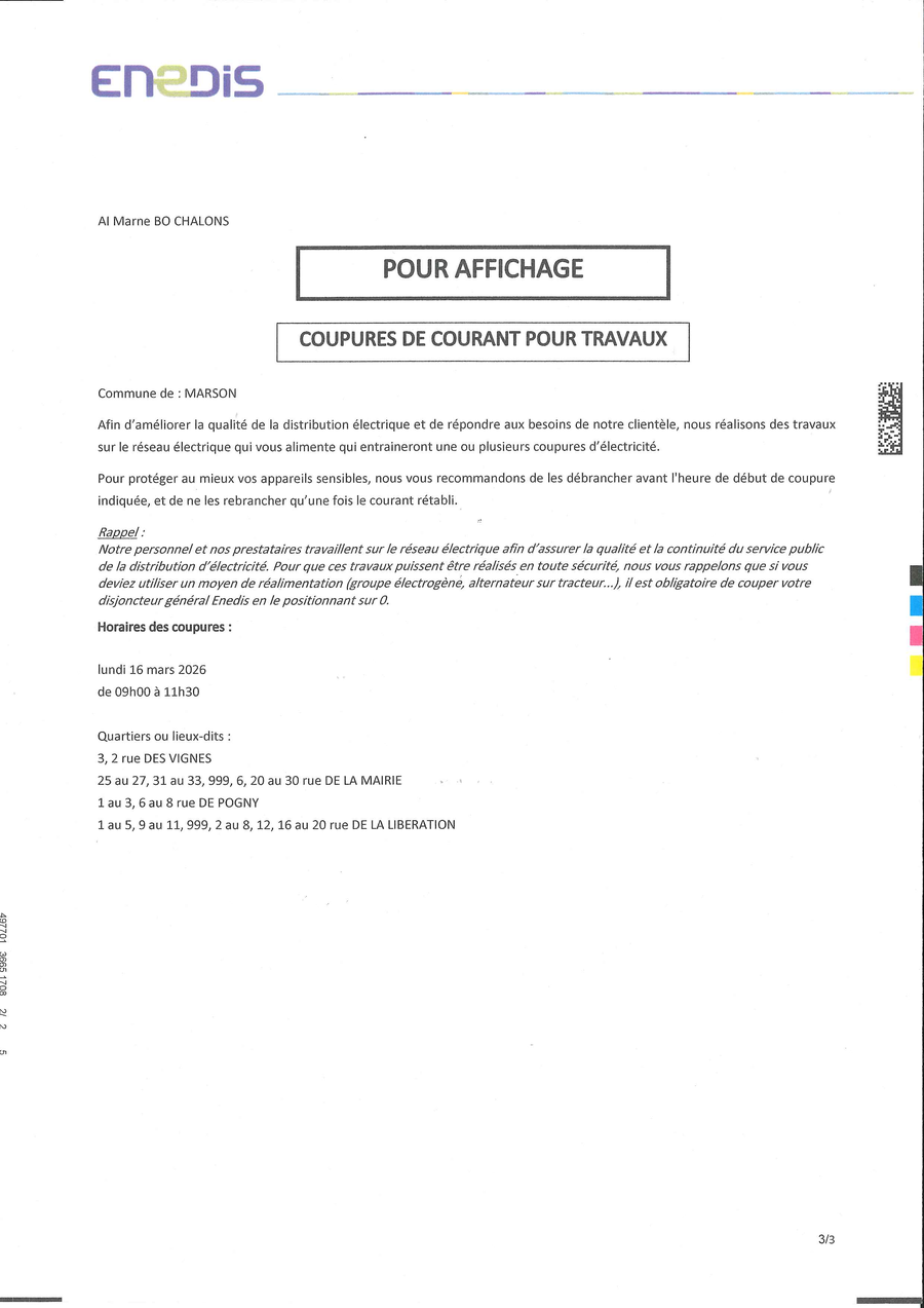 ENEDIS nous informe d'une coupure de courant le lundi 16 mars 2026 de 9h00 à 11h30.