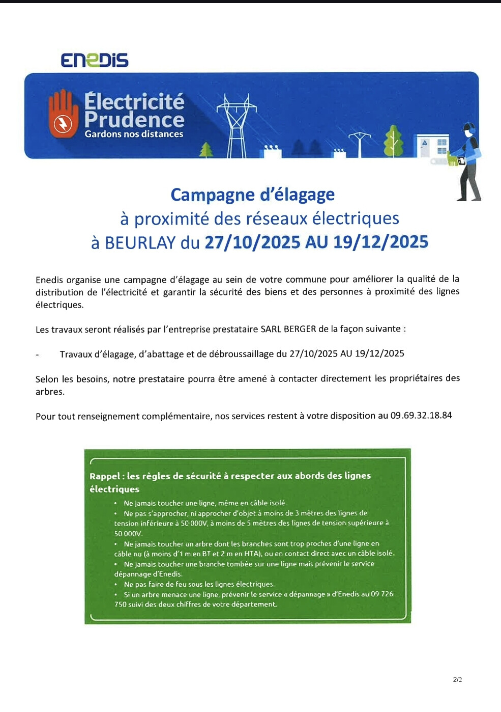 Dans le cadre de l’entretien des réseaux électriques, une campagne d’élagage sera réalisée sur le territoire de la commune afin d’assurer la sécurité des installations et la continuité de la distribution d’électricité.