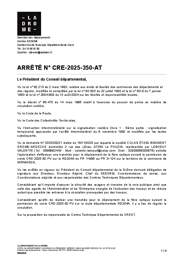 Le Département nous informe de travaux entre le vendredi 21 novembre et le vendredi 28 novembre 2025, sur la RD204A pour le déploiement de la fibre.