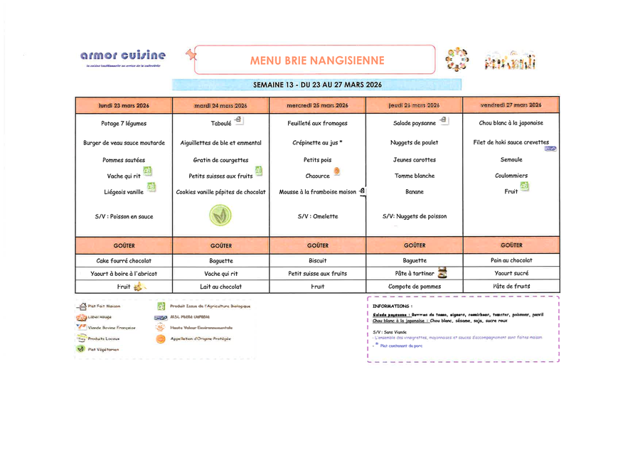 MENUS DU 23 AU 27 MARS 2026