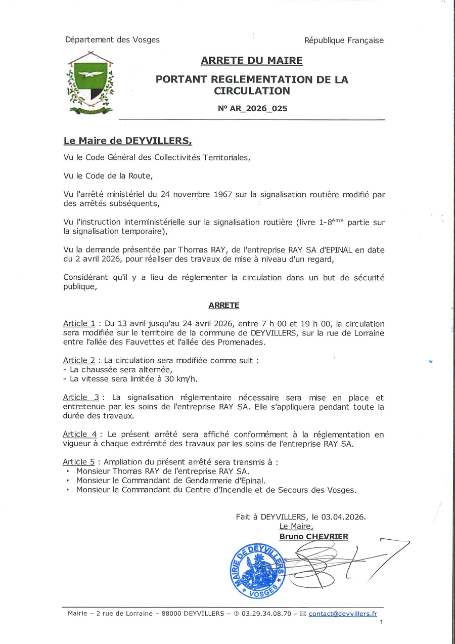 En raison de travaux de mise à niveau d'un regard sur la rue de Lorraine entre la rue des Fauvettes et l'allée des Promenades, la circulation sera modifiée: