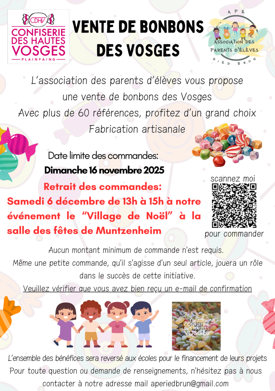 L’Association des Parents d’Élèves du Ried Brun vous propose une vente de délicieux bonbons artisanaux de la Confiserie des Hautes Vosges (Plainfaing) ! 😋
