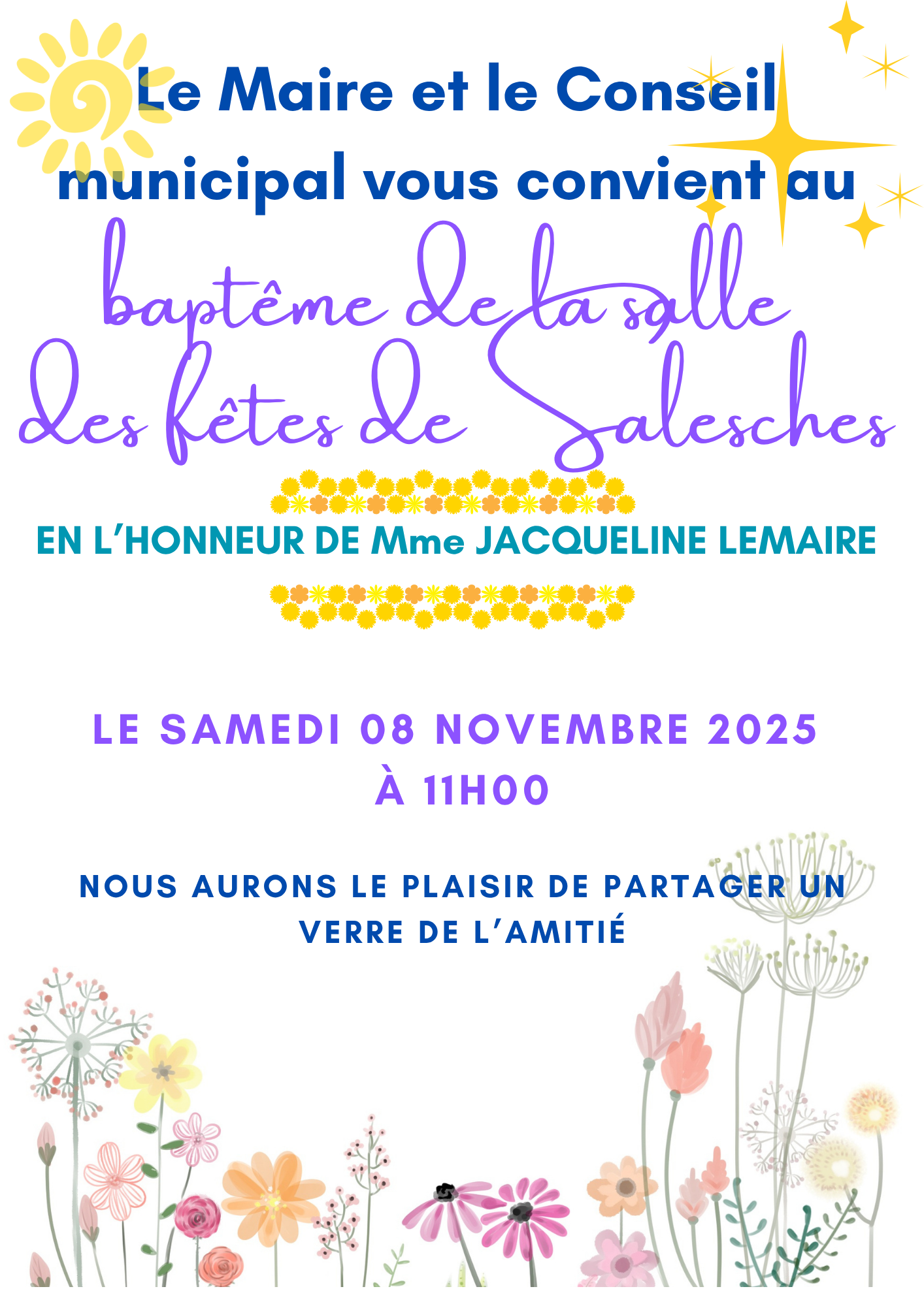 Dans ce contexte, une cérémonie de baptême de la Salles des Fêtes se tiendra ce Samedi 8 novembre 2025 à 11h, en présence de la famille.