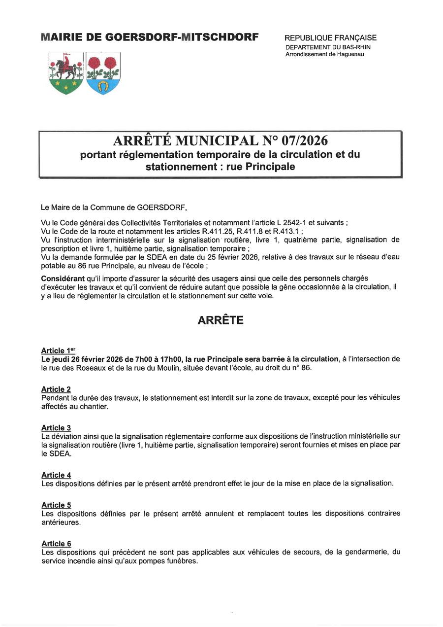 86 RUE PRINCIPALE : TRAVAUX SUR RESEAUX D'EAU