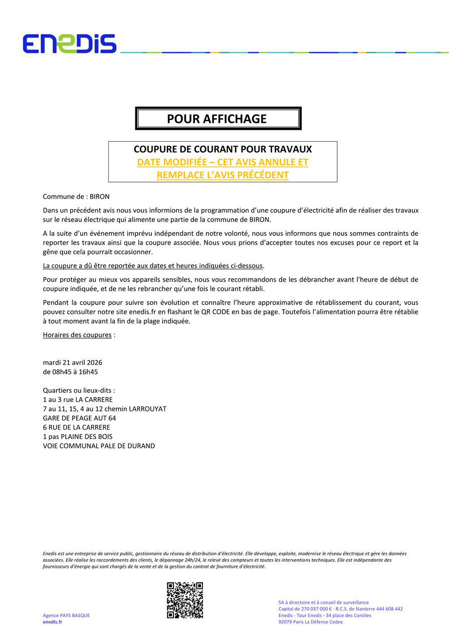 La coupure de courant initialement prévue le 5 mai 2026 est reprogrammée au 21 Avril 2026.