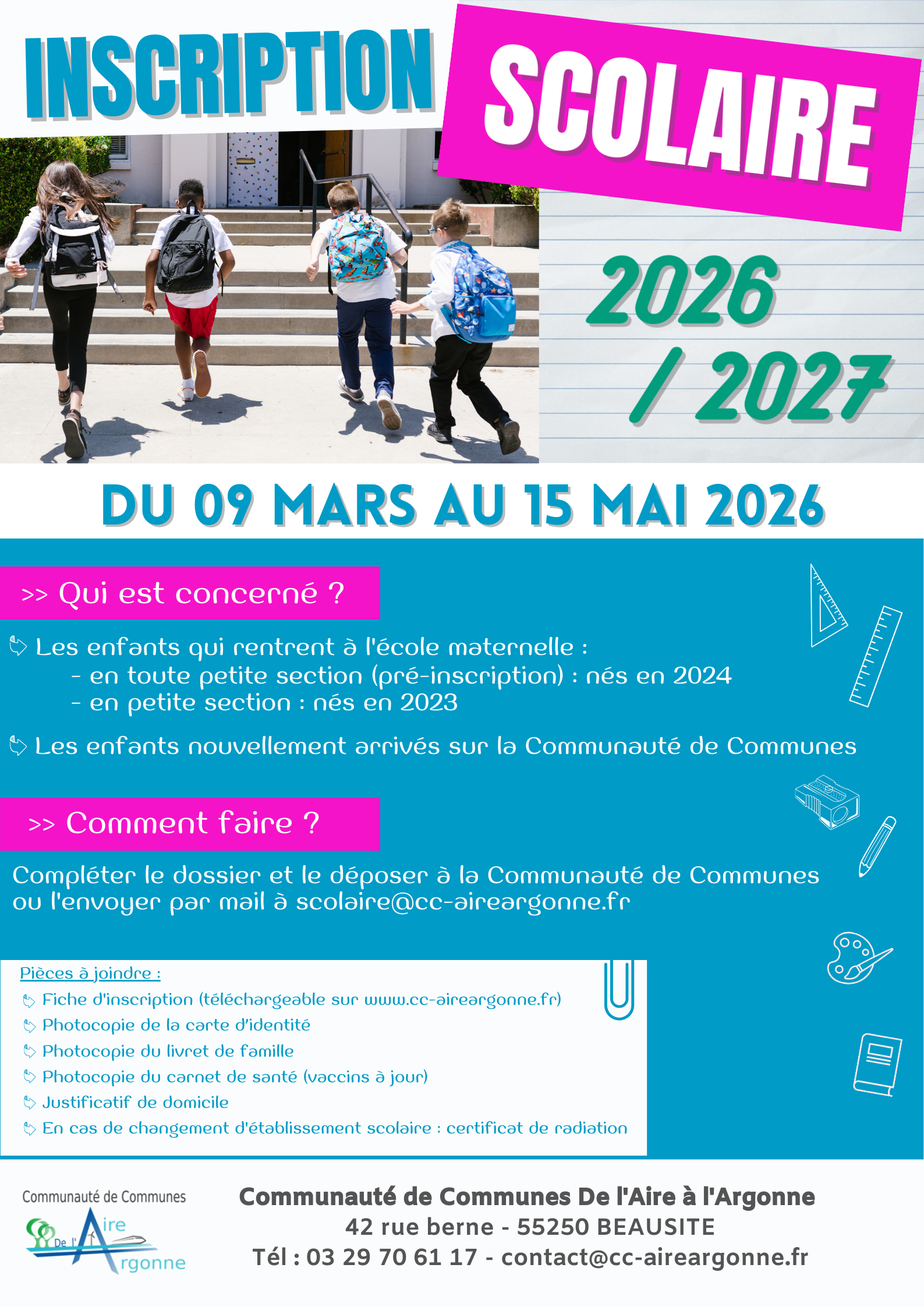 📝 L'inscription scolaire est ouverte jusqu'au vendredi 15 mai 2026 auprès du service scolaire de la Communauté de Communes !