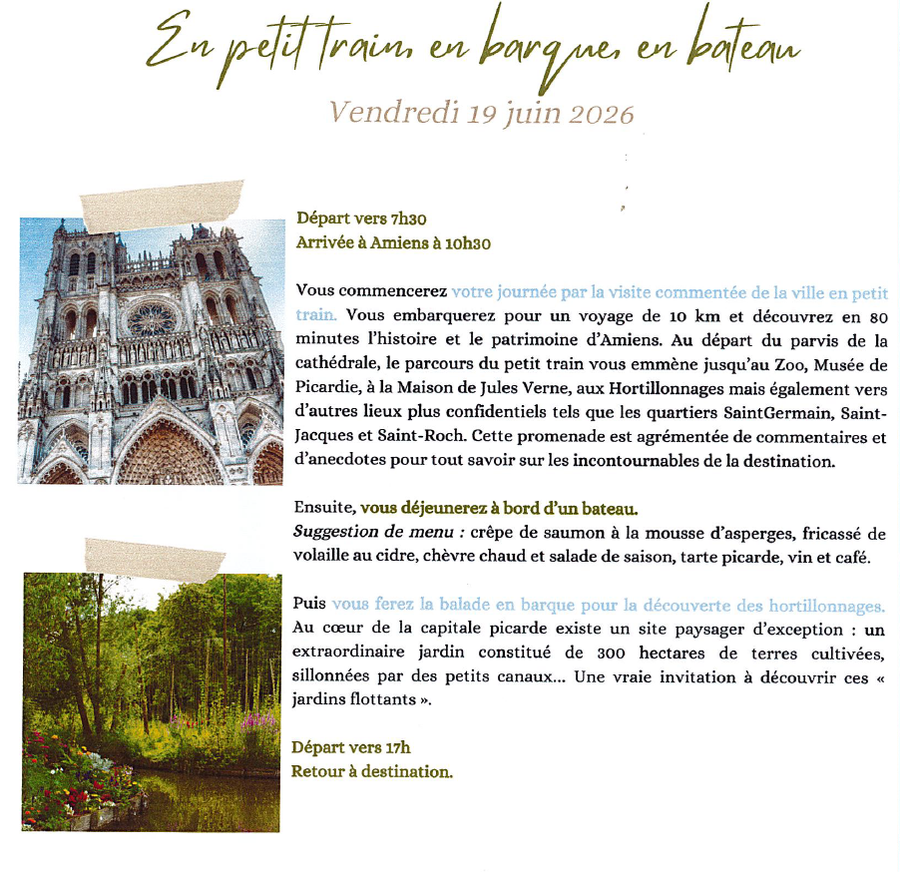 Il vous est proposé une visite commentée de la ville en petit train, un déjeuner à bord d'un bateau puis une balade en barque pour découvrir les hortillonnages.